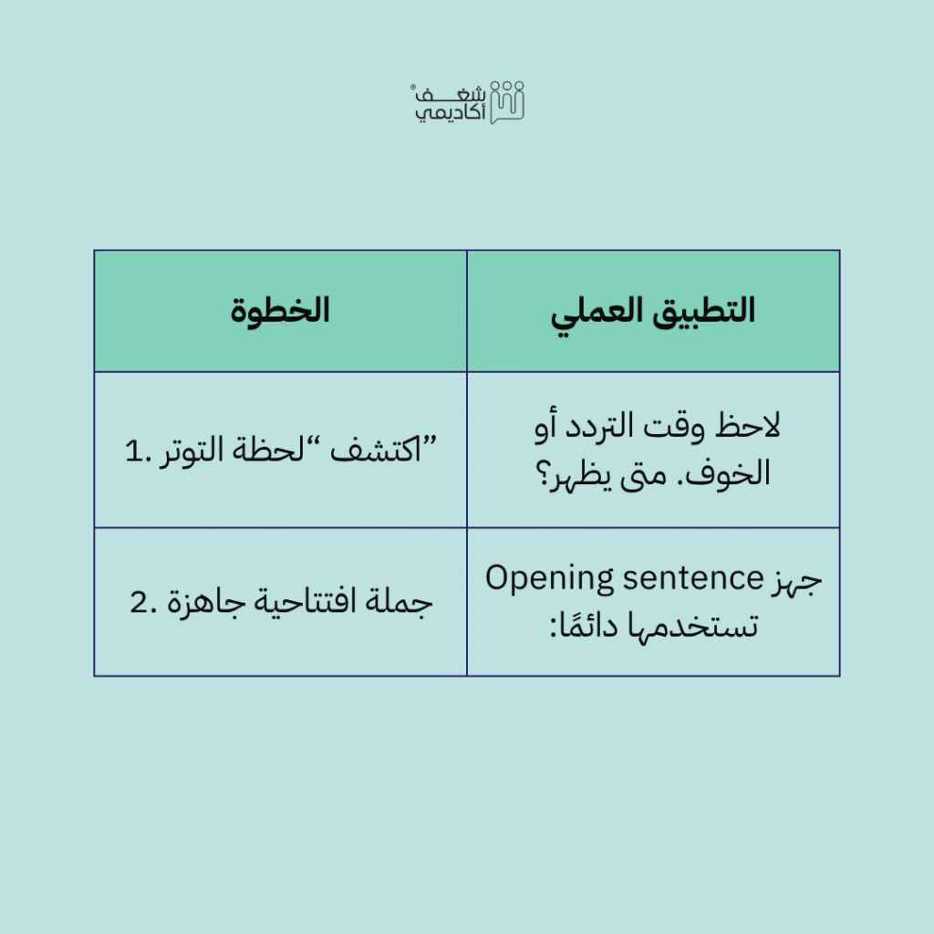 | 3. تدرب على بيئة تحاكي الواقع | استخدم محادثات وهمية، أو تدرب أمام زميل موثوق |